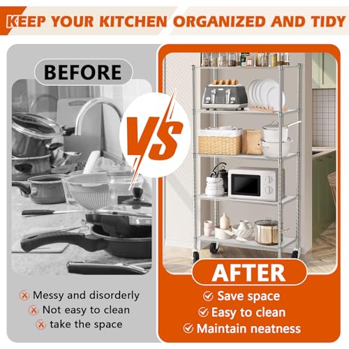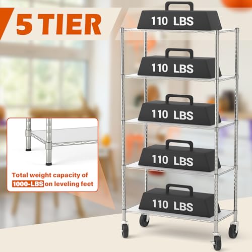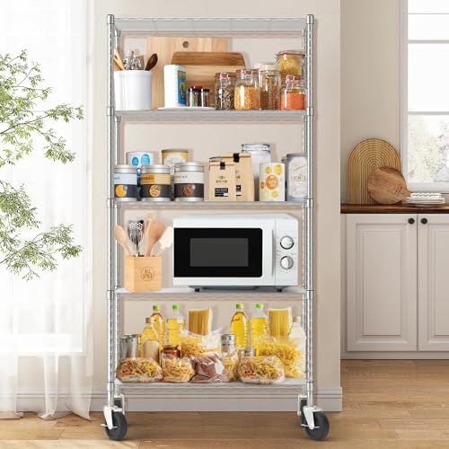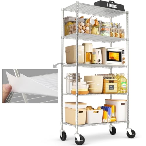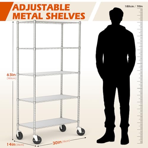 Chrome 5-Shelf Shelving Units and Storage Rack on Wheels with Shelf Liners Set of 5, NSF Certified, Adjustable Matel Wire Shelving Unit Rack for Garage, Kitchen, Office, (63H X 30W X 14D)