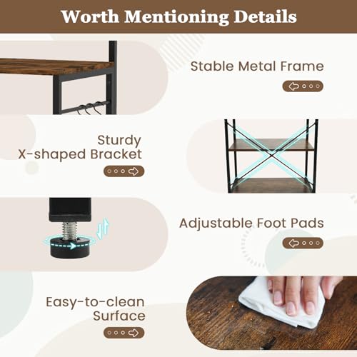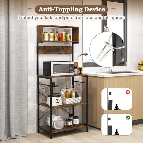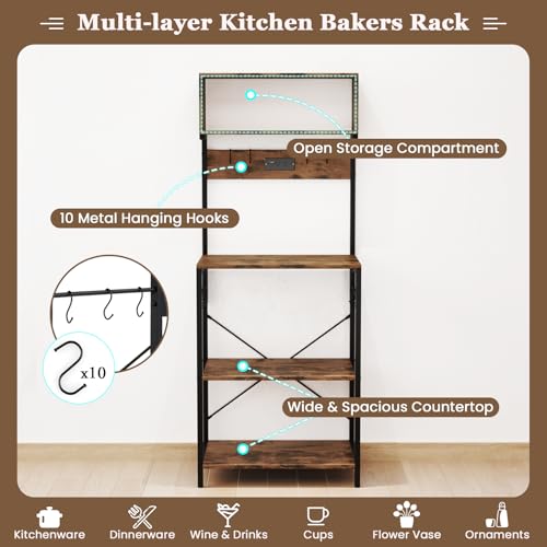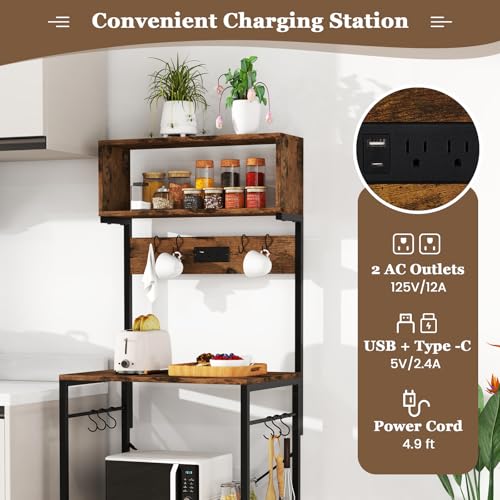 GOFLAME Kitchen Bakers Rack with Power Outlet, 60” Tall Microwave Stand with Open Shelves & 10 Hanging Hooks, Multifunctional Coffee Bar Station for Kitchen, Dining Room, Living Room, Rustic Brown