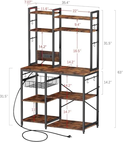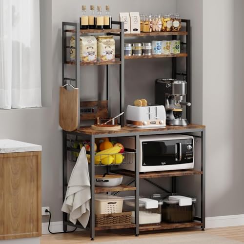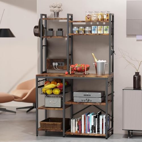Standing Kitchen Baker’s Rack, Bakers Rack with Power Outlet, 6-Tier Microwave Stand, Coffee Bar with 12 S-Shaped Hooks, Kitchen Shelf with Storage, Coffee Bar Station, for Rustic Brown