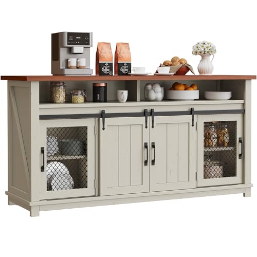 Impressive Storage Capacity: This expansive sideboard boasts an incredible 4-door storage system, featuring 2 sliding barn doors and 2 visible grille doors. The generous 63-inch wide countertop provides ample space for housing coffee makers, microwaves, baking supplies, and other essential items
