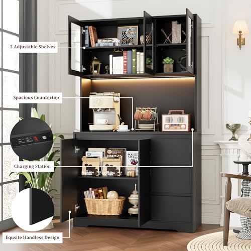 FINETONES 71″ Kitchen Pantry Cabinet with LED Lights and Charging Station, Modern Kitchen Cabinet Hutch Cabinet with Storage and Microwave Stand, Pantry Cabinet Buffet Cabinet with Countertop, Black