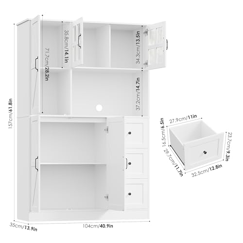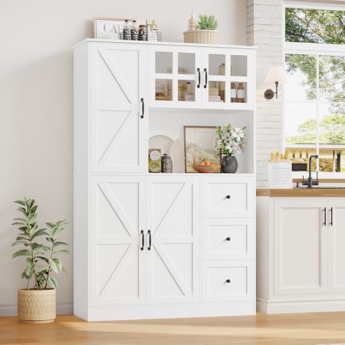 FINETONES Farmhouse Pantry Cabinet, Kitchen Pantry Storage Cabinet with Microwave Stand, Ktichen Hutch Food Pantry with Open Countertop and Adjustable Shelf for Kitchen Dining Room, White