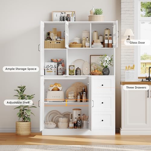 Space-Saving Kitchen Pantry: Looking for more flexible and convenient storage in a compact structure? This pantry cabinet has 6 compartments, a spacious countertop, and 3 smooth sliding drawers. The lower cabinet is equipped with an adjustable shelf, which can freely adjust the height and size of the space, and the upper cabinet is equipped with a glass door for easy viewing of items to accommodate frequently used items for easy access
