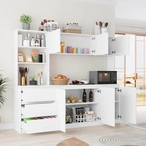 UPGRADE YOUR KITCHEN STORAGE: Featuring ample compartments, 4 cupboards, a 3-tier external shelves and 3 easy-glide drawers, this functional buffet cabinet provides both open areas and hidden spaces to keep all your kitchen appliances and cooking accessories well organized.