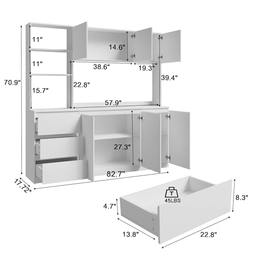 STABLE STRUCTURE: STABLE STRUCTURE: Our pantry storage cabinet is made of high-quality MDF board, which has excellent stability and long-lasting durability. The accompanying anti-tipping device ensures safety, and each drawer can withstand a weight of 45 pounds.Overall size: 17.72″D x 82.7″W x 70.9″H.