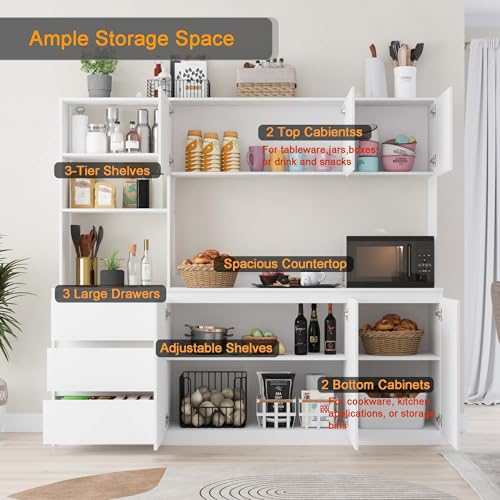 Large Kitchen Hutch Cabinet, Kitchen Pantry Cabinet with 3-Tier External Shelves and 3 Drawers, Storage Cupboard Cabinet with Microwave Shelf, Modern Food Pantry Cabinet for Dining Room, White
