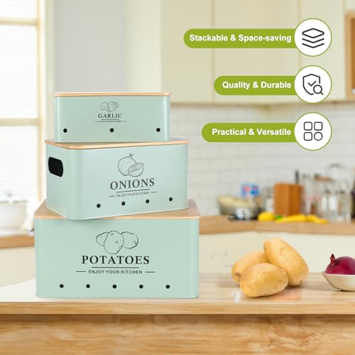 Kitchen Vegetable Storage Set of 3, Metal Onion Garlic Potato Storage Set, Kitchen Canisters Vegetable Keeper Containers with Aerating Holes and Wooden Lid (Sage Green)