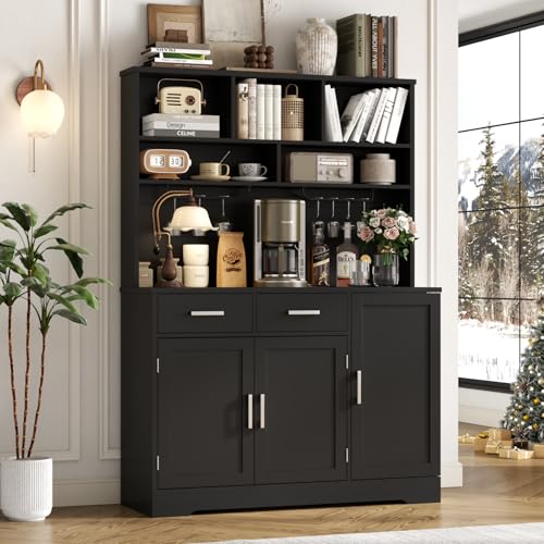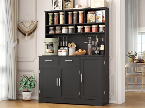 Kitchen Pantry Storage Cabinet with 2 Drawers, Tall Kitchen Hutch with Microwave Stand, Modern Buffet Cabinet with Goblet Holders, Food Pantry with Adjustable Shelves for Dining Room, Black