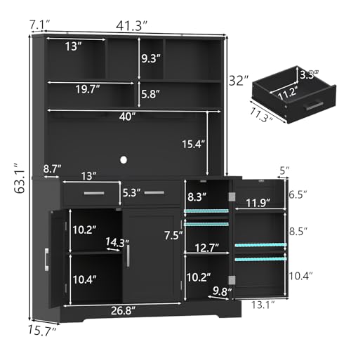 [Modern Buffet Cabinet with Hutch]-This tall kitchen hutch with microwave stand is designed a simple black finish, clean and smooth lines, three-dimensional door frames, and silver handles add a touch of elegance and sophistication, complementing the clean black finish perfectly, emanating a touch of minimalist aesthetic, adding a charming and modern touch to any dining room or living area.