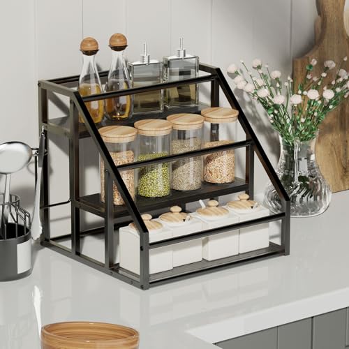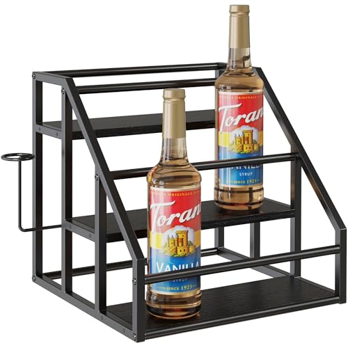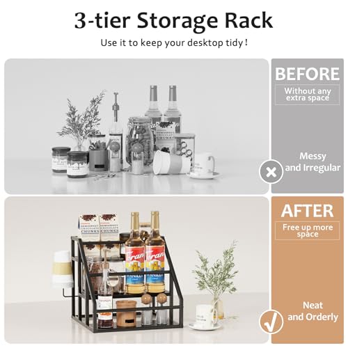 Spice Rack Organizer, 3 Tier Countertop Storage Shelves, Kitchen Storage, Syrup Bottle Stand Holder for Wine, Liquor, Kitchen Coffee Station Organizer Rack, 13.8″x13.4″x13.0″,Black