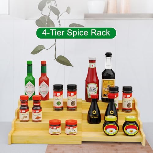 Spice Rack Organizer for Expandable 4-Tier, Adjustable Bamboo Spice Storage for Kitchen Cabinet, Pantry and Countertop Organization, Natural